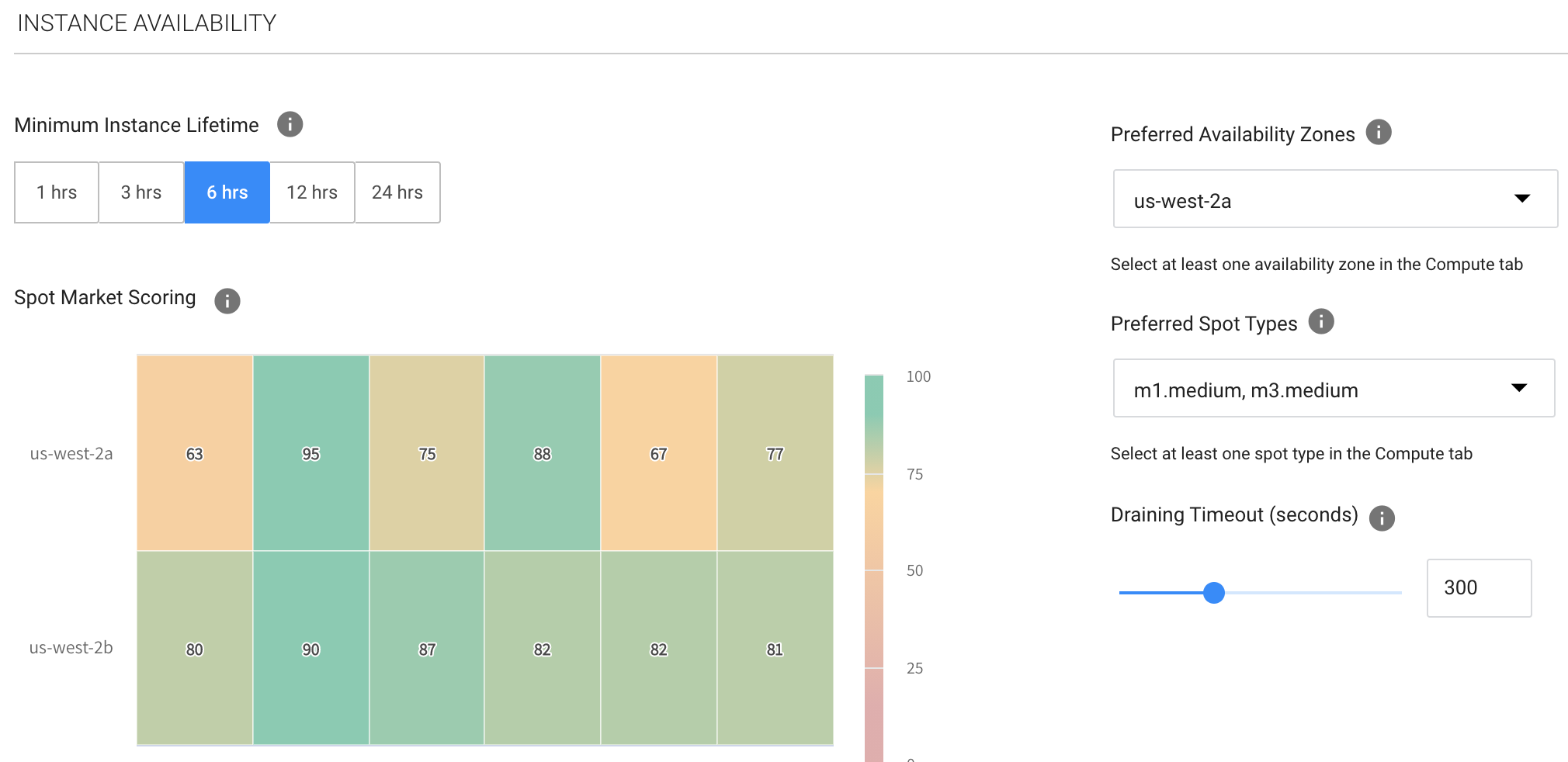 • Minimum Instance Lifetime: The desired amount of time you wish your workloads to run without any interruption to their underlying instances. The shorter the lifetime you choose, the more accurate the market scoring will be.