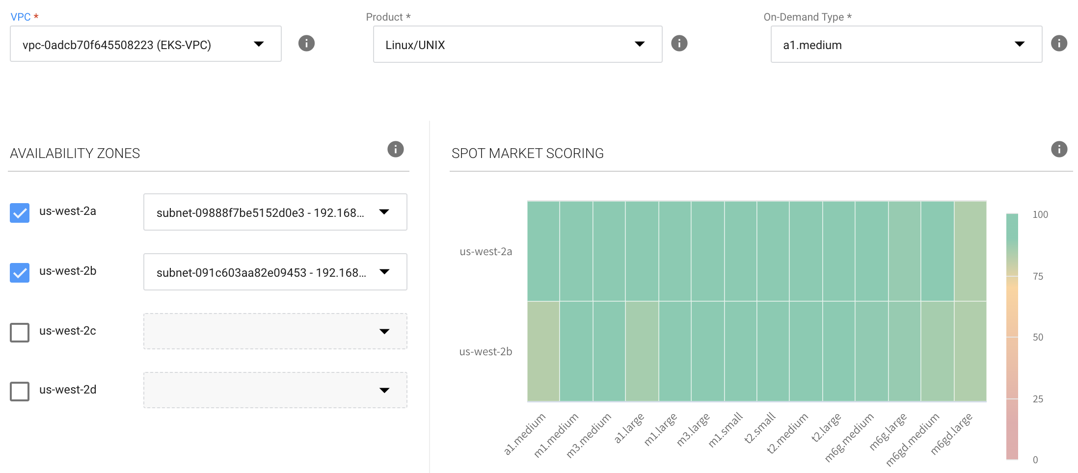 2. Choose one or more Availability Zones (AZs) Elastigroup should consider when launching your instances. To maximize your savings, Elastigroup calculates the cost of launching spot instances in the selected AZs. We recommend selecting multiple Availability Zones to increase the number of spot instance markets available for Elastigroup to consider.